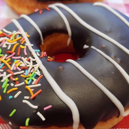 Dona decorada con chocolate oscuro y lineas de glas de nata