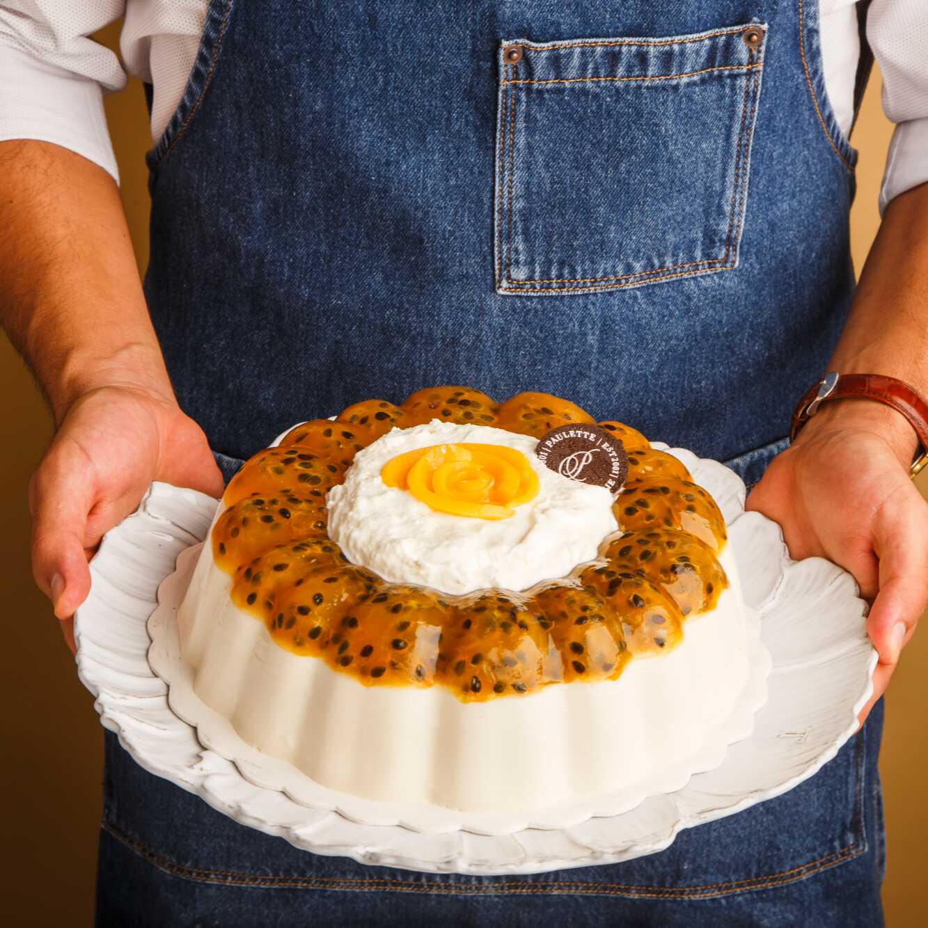 Ligera gelatina de yogurt con exótico topping de fruta de la pasión y mousse de mango. Creación baja en grasa.