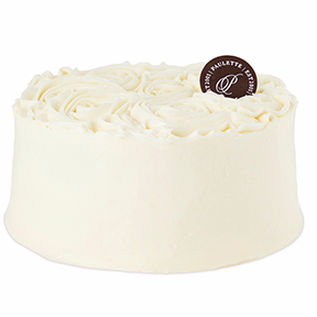 Tres capas de esponjoso bizcocho de chocolate rojizo cubierto por rosetones de crema de queso.