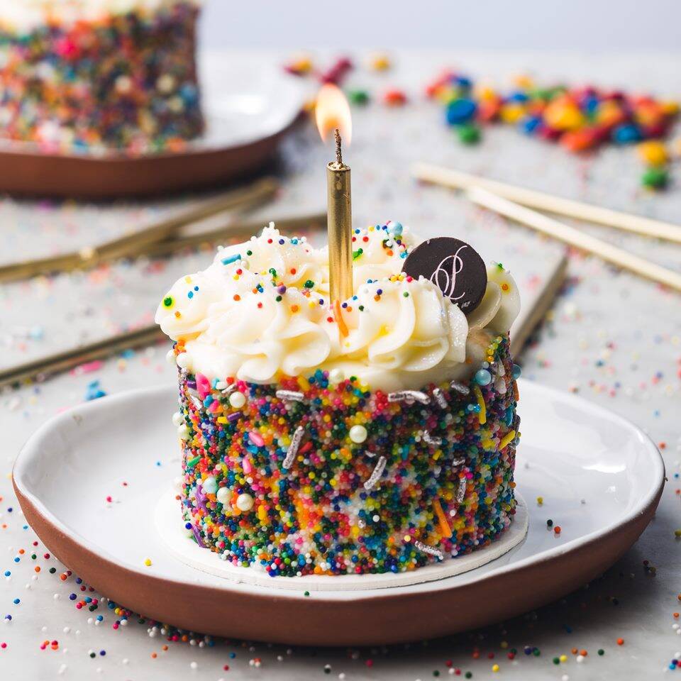 Bizcocho de vainilla, confeti y un sorpresivo corazón de m&m´s, cubierto con ligera crema de queso y miles de destellos de colores.