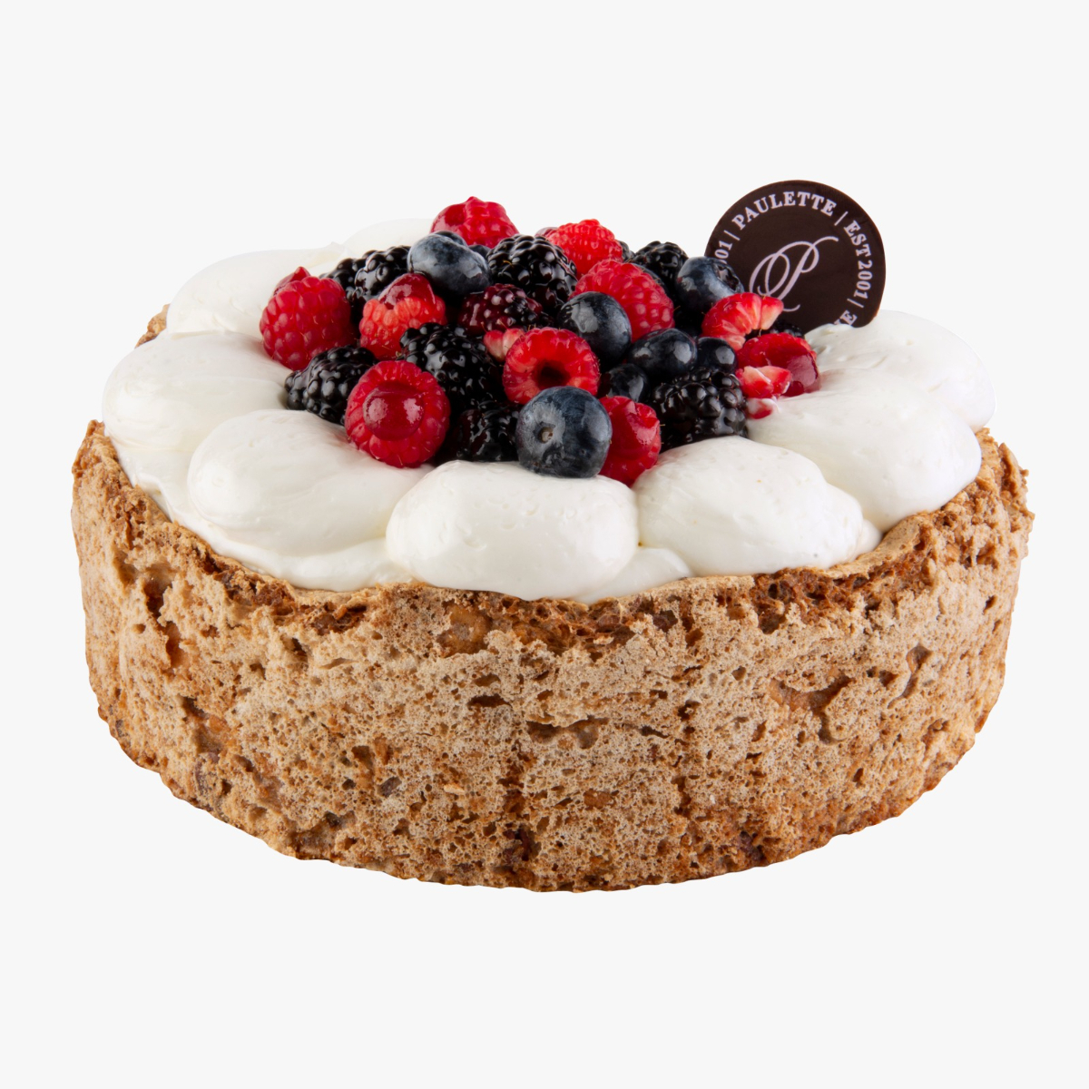 Base de nueces crocantes, crema de yogurt sedosa y gelée de frambuesa, coronado con una avalancha de zarzamoras, blueberries y frambuesas.