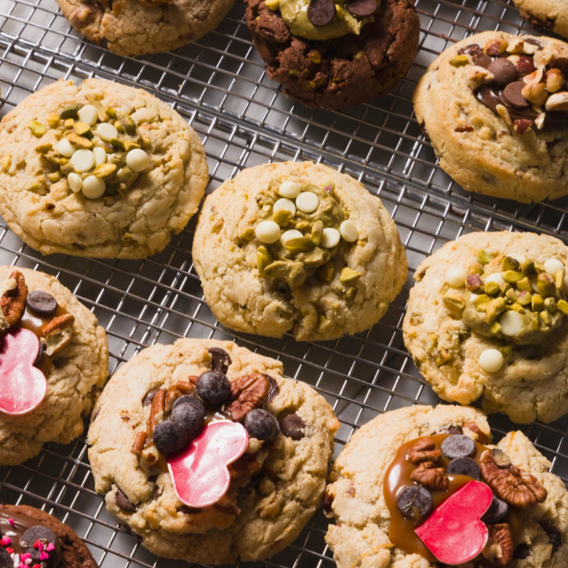 6 Cookies estilo Nueva York, suaves por dentro y crujientes por fuera La selección incluye: Nuez pecana · Caramelo a la salAvellana · Chocolate de leche Triple chocolate Pistache · Chocolate blanco Chocolate. Pistache Speculoos