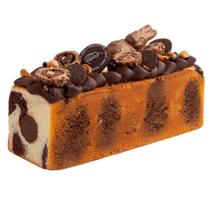 Cremoso panqué marmoleado de chocolate y vainilla que guarda un delicioso secreto en su interior, un ganache de avellanas tostadas y chocolate 56% cacao.