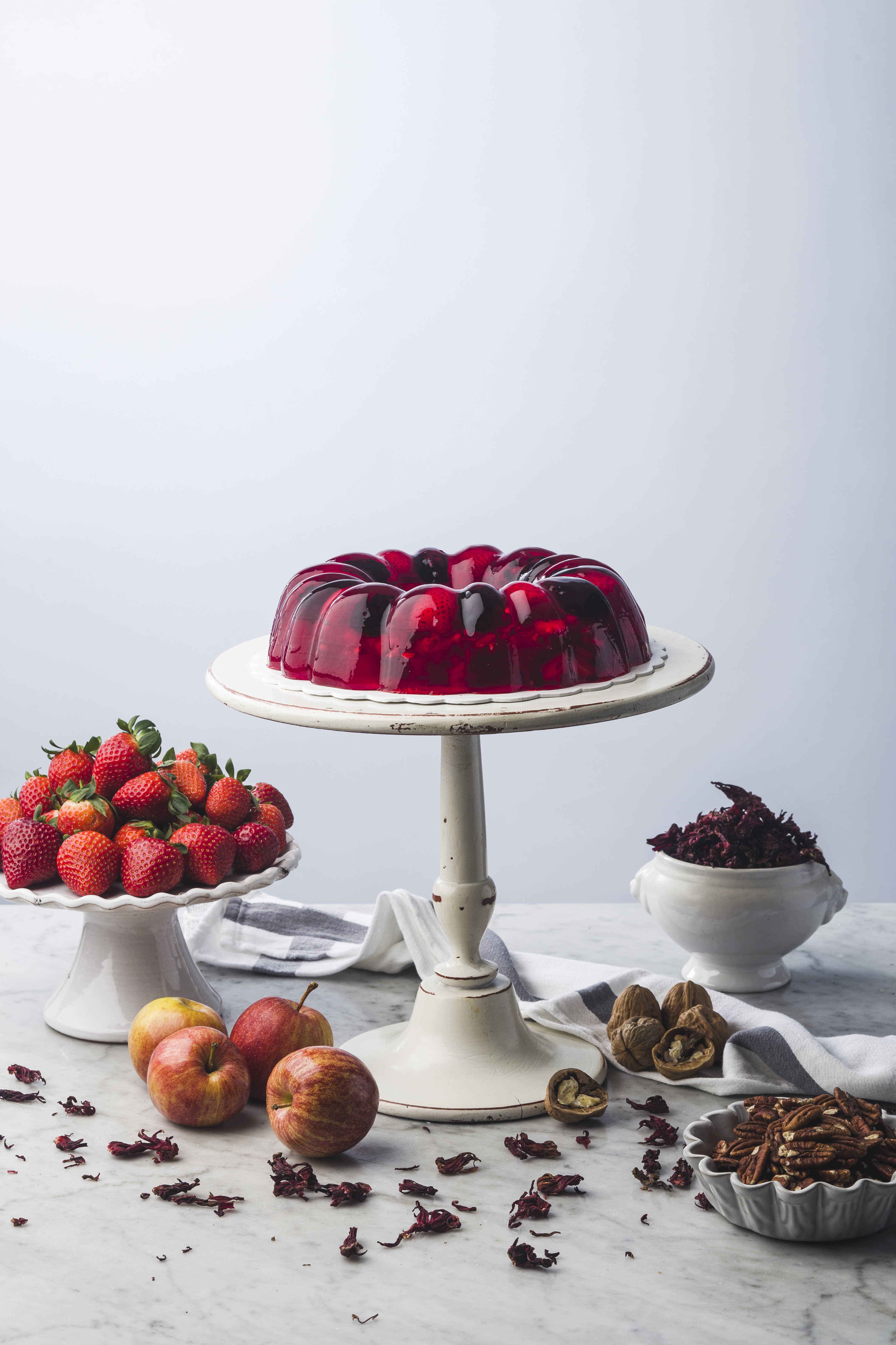 Gelatina de frutos rojos, fresas, uva, manzana, frambuesa y nuez libre de azúcar.