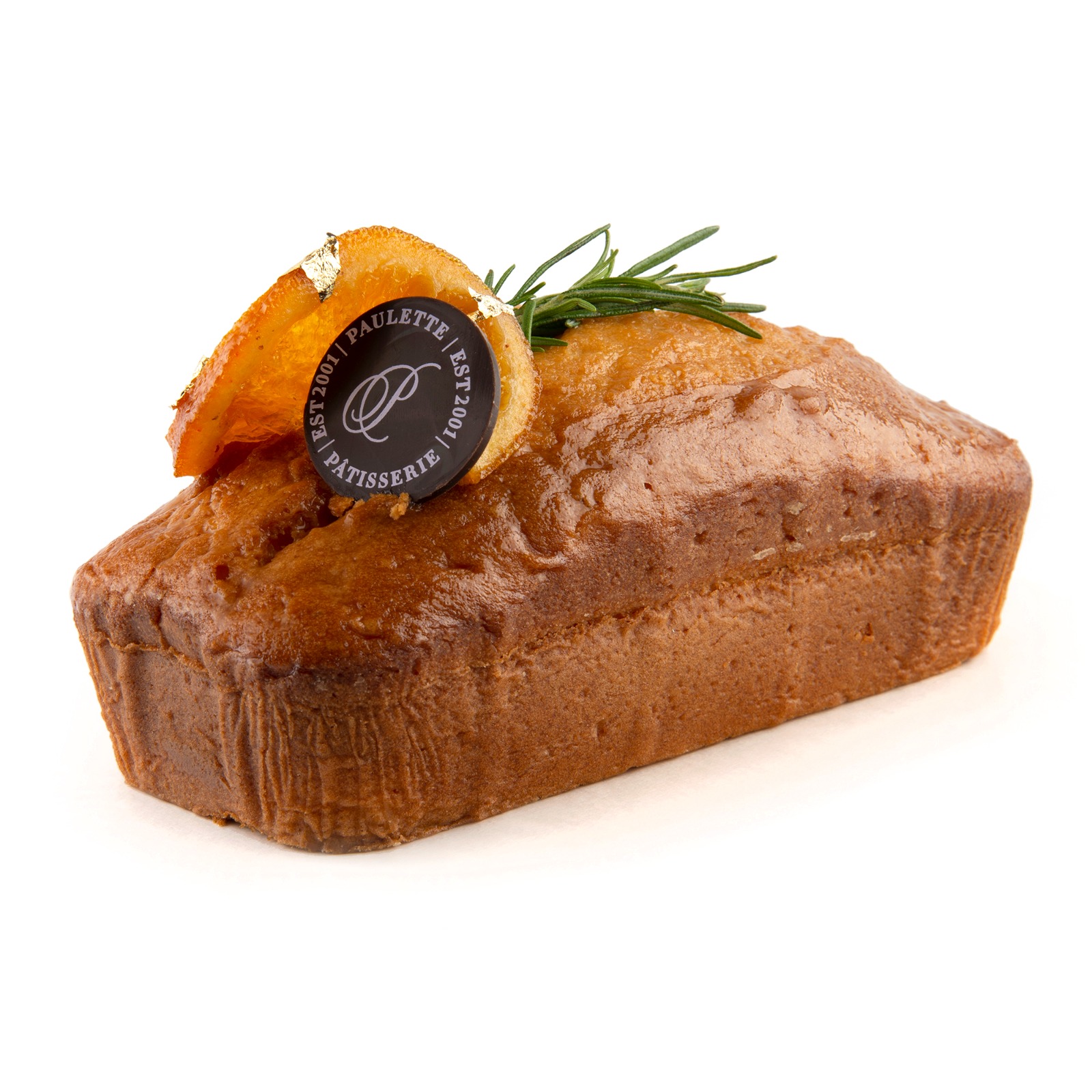 Bundt cake de naranja embebido de miel de romero fresco y naranjas confitadas.
