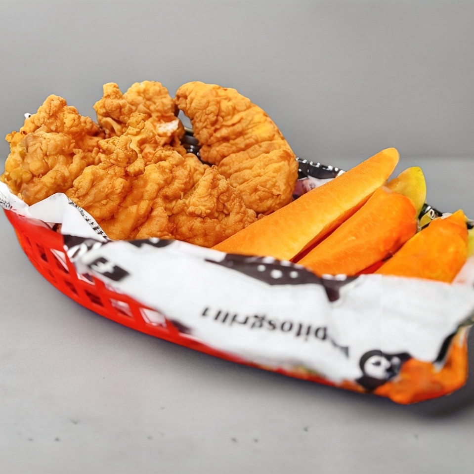 Tiras 100% de pollo empanizado. Elige tu salsa favorita.