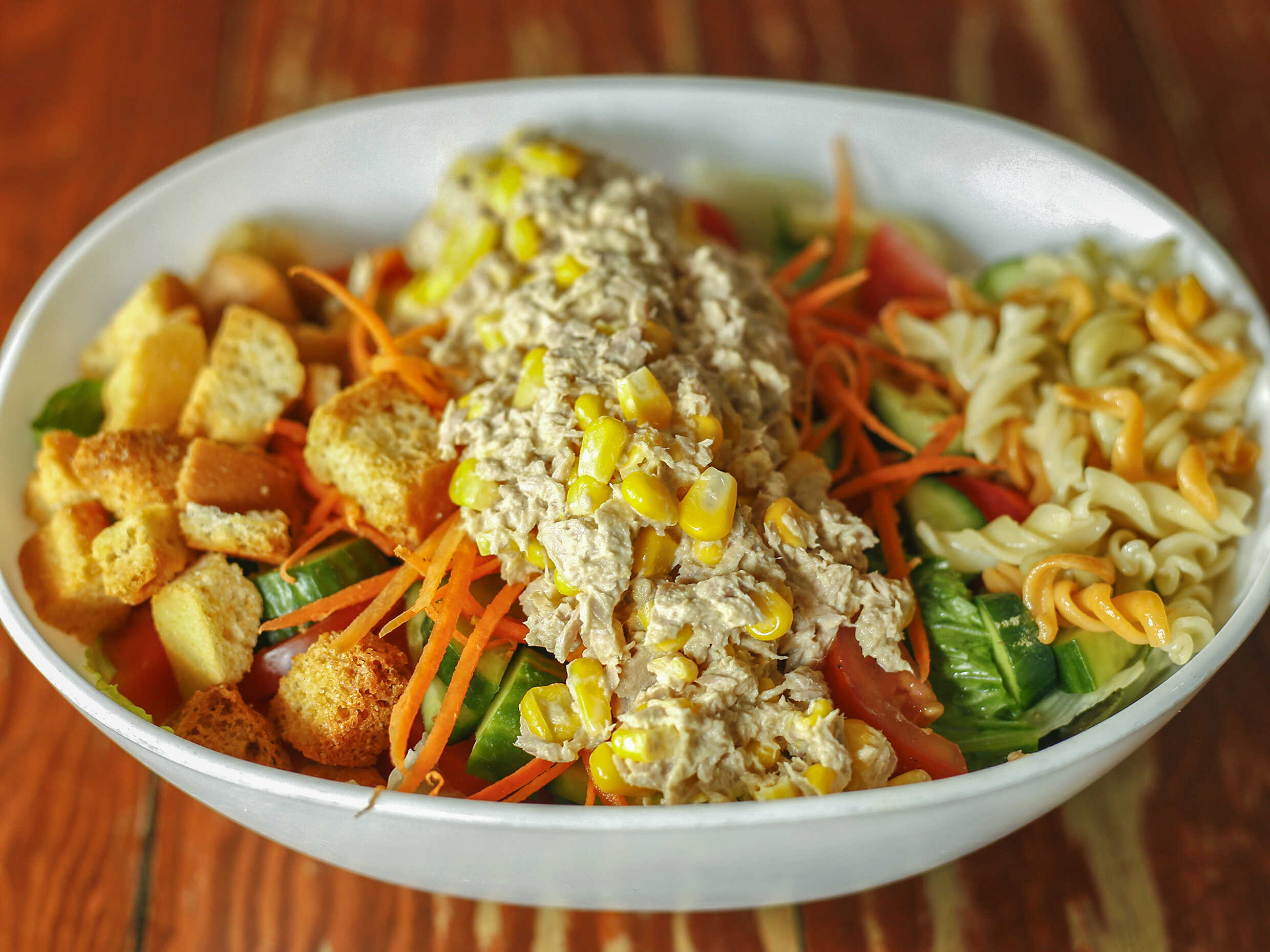 Atún acompañado de elote y mayonesa con base de lechuga, jitomate, zanahoria, pepino, pasta y crotones.