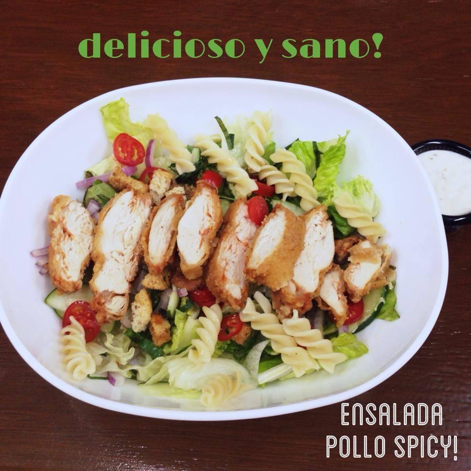 Crujiente pechuga de pollo empanizado bañada en nuestra salsa bufalo, con base de lechuga, jitomate, zanahoria, pepino, pasta y crotones o frituras de tortillas.