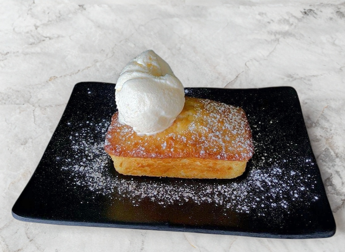 pan crujiente con azucar y canela, relleno de manzana acompañado de nieve y caramelo liquido