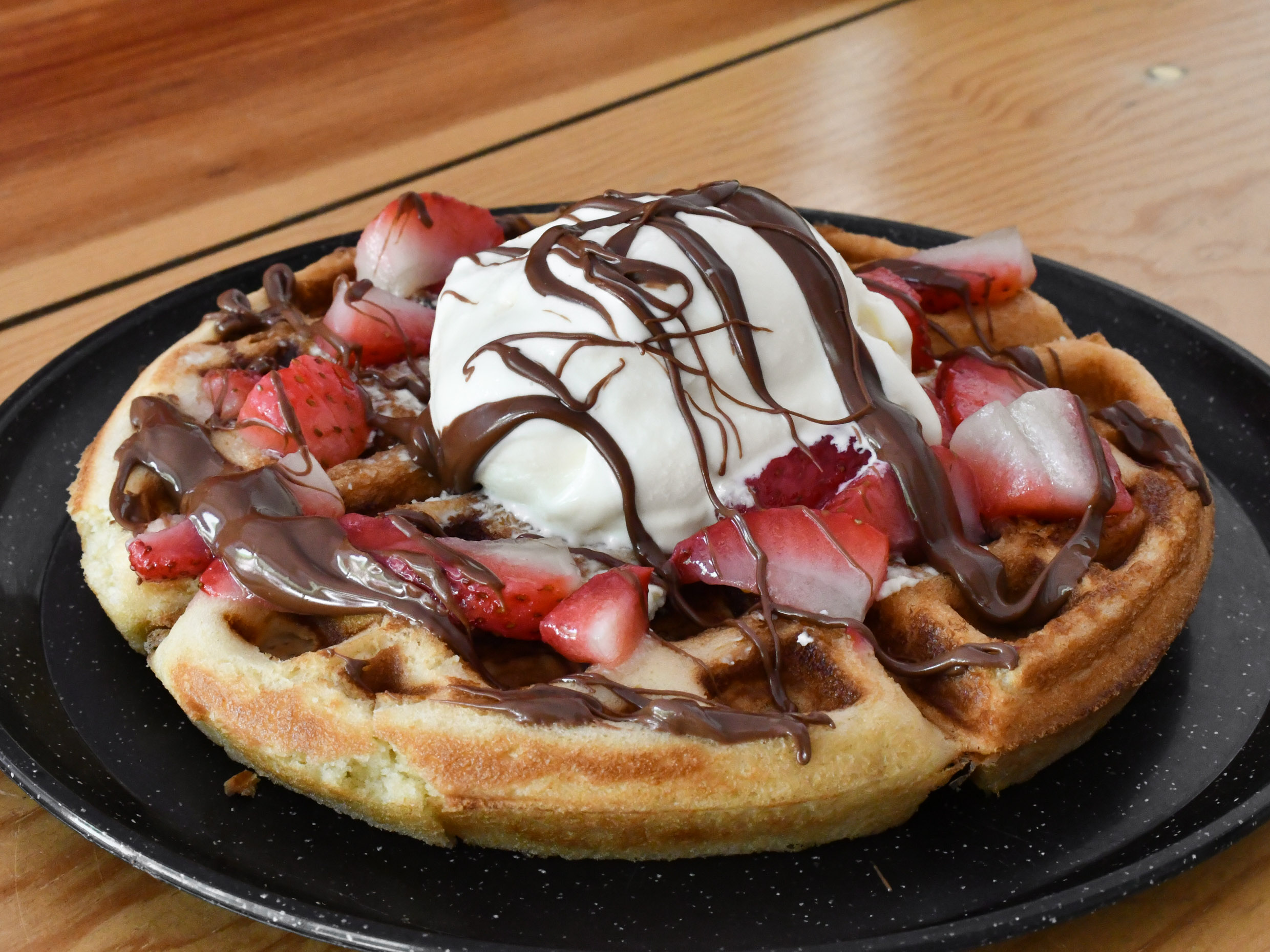 (Pan de Waffle con jamon, queso gouda, espinacas y un huevo frito,tocino, bañado en mapple y papas a la francesa)