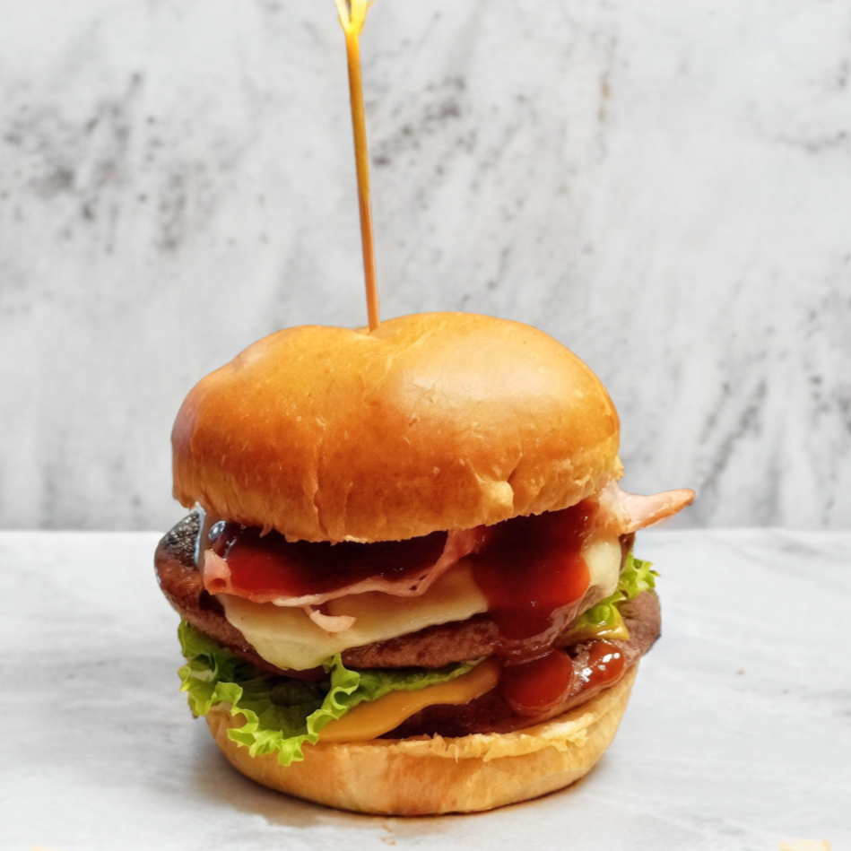 Pan brioche con doble carne de arrachera , doble queso, tocino, salsa bbq, jitomate y lechuga.