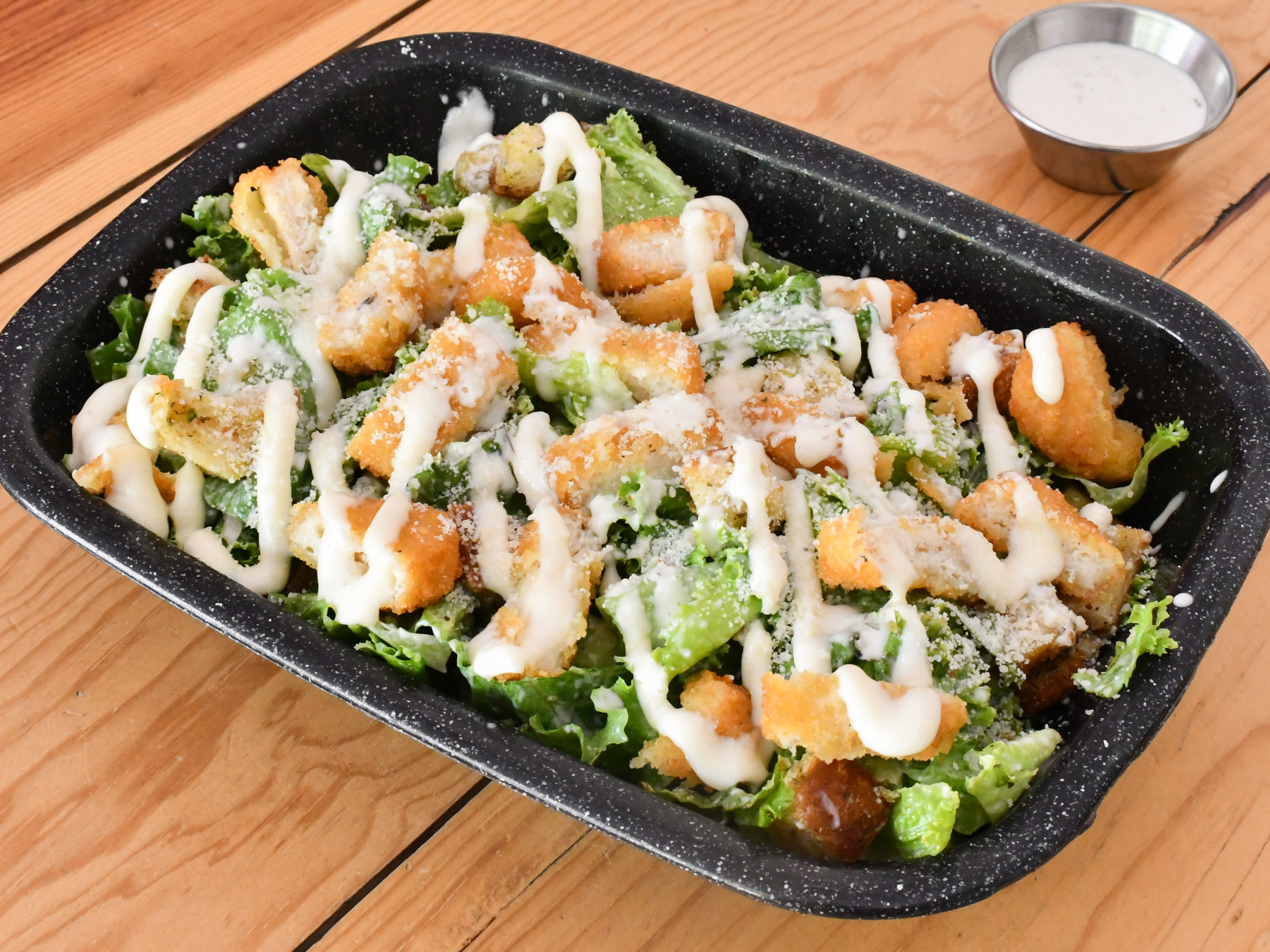 Lechuga romana, pollo empanizado, crutones, aderezo cesar, tomate cherry y un toque de parmesano