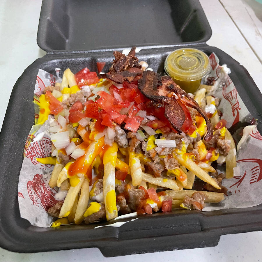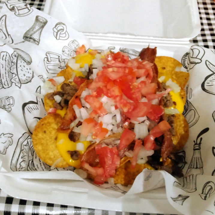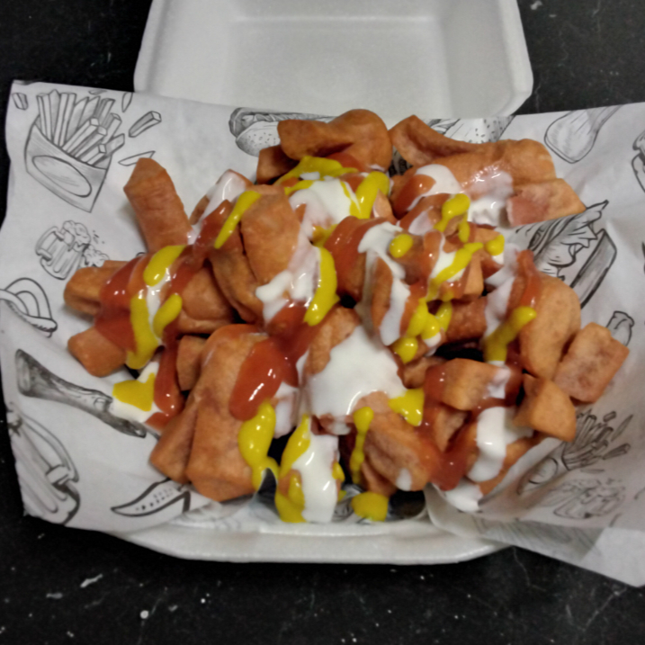 papitas doraditas bañadas en queso amarillo, acompañados con carne molida, crema, catsup, mostza, jitomate y cebolla.