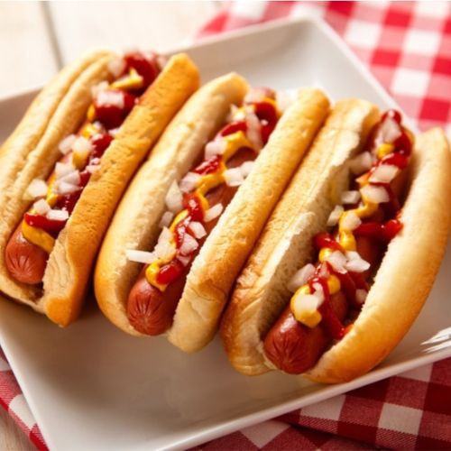 delicioso hot dog con salchicha de pavo, tocino, pan para hamburguesa, jitomate y cebolla