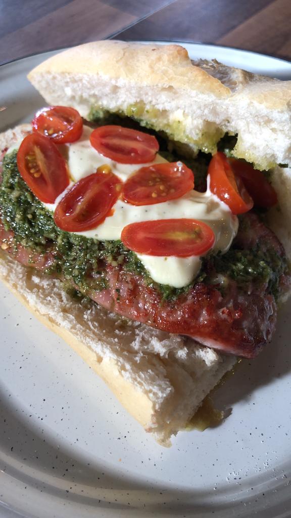 Baguette con argentino, pesto, mayonesa de la casa y cherrys