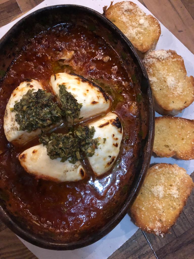 Con chimichurri, salsa pomodoro, acompañada de pan al ajo