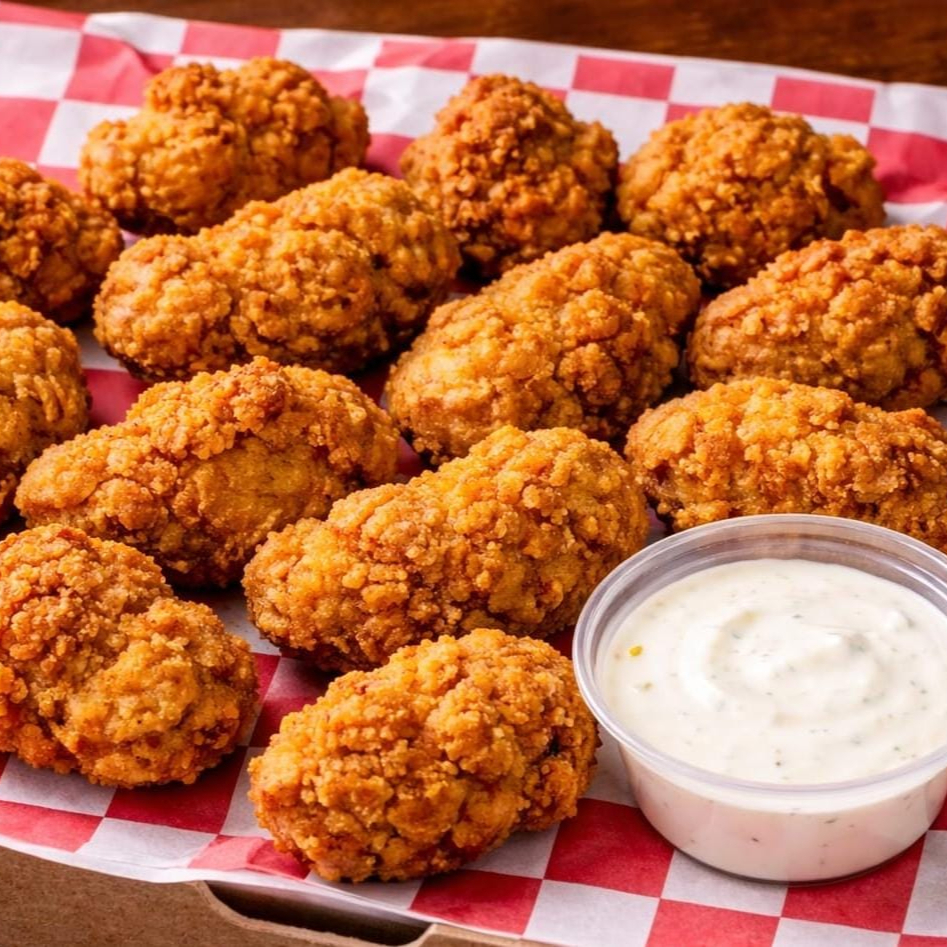 Exquisitos boneless de pollo empanizado acompañados de aderezo ranch.