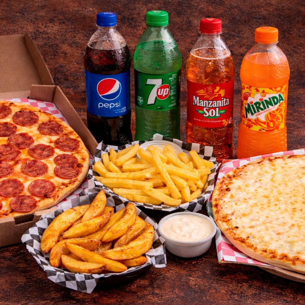 2 Pizzas 30 cm, 2 papas, 4 refrescos.