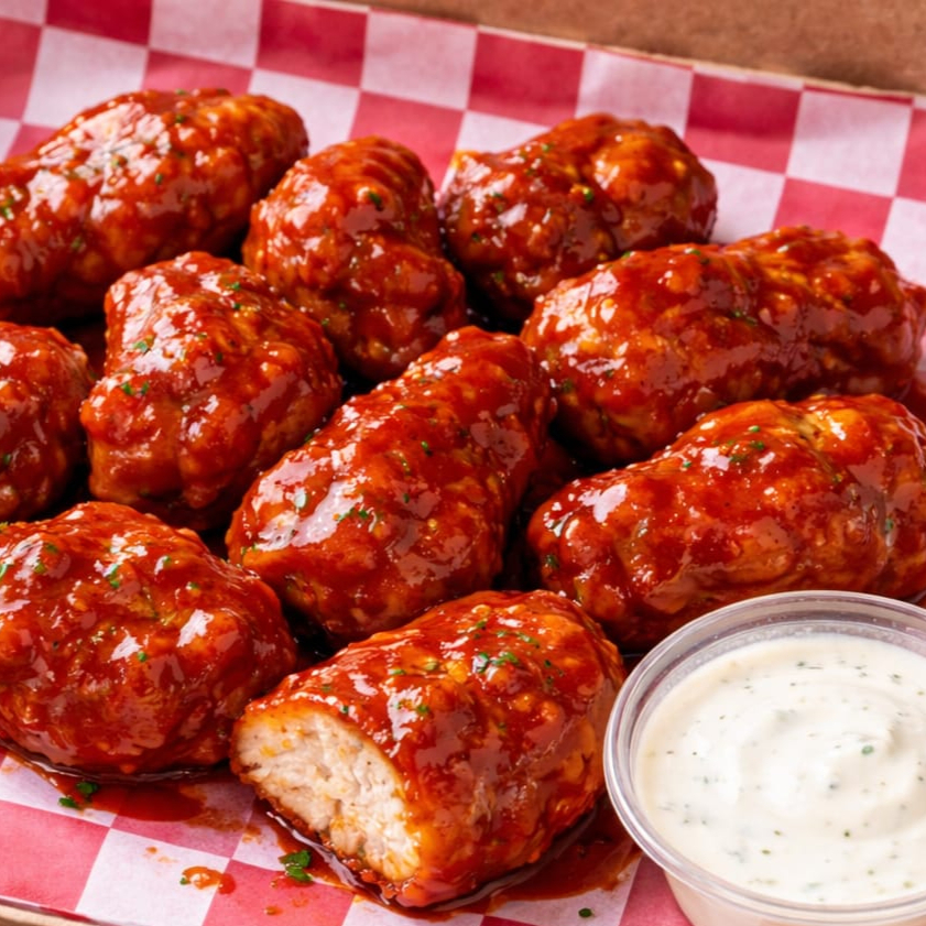 Exquisitos boneless de pollo empanizado bañados en salsa BBQ acompañadas de aderezo ranch.
