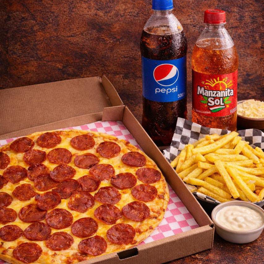 Una pizza de 30 cm, orden de papas 300g y dos refrescos de 355 ml