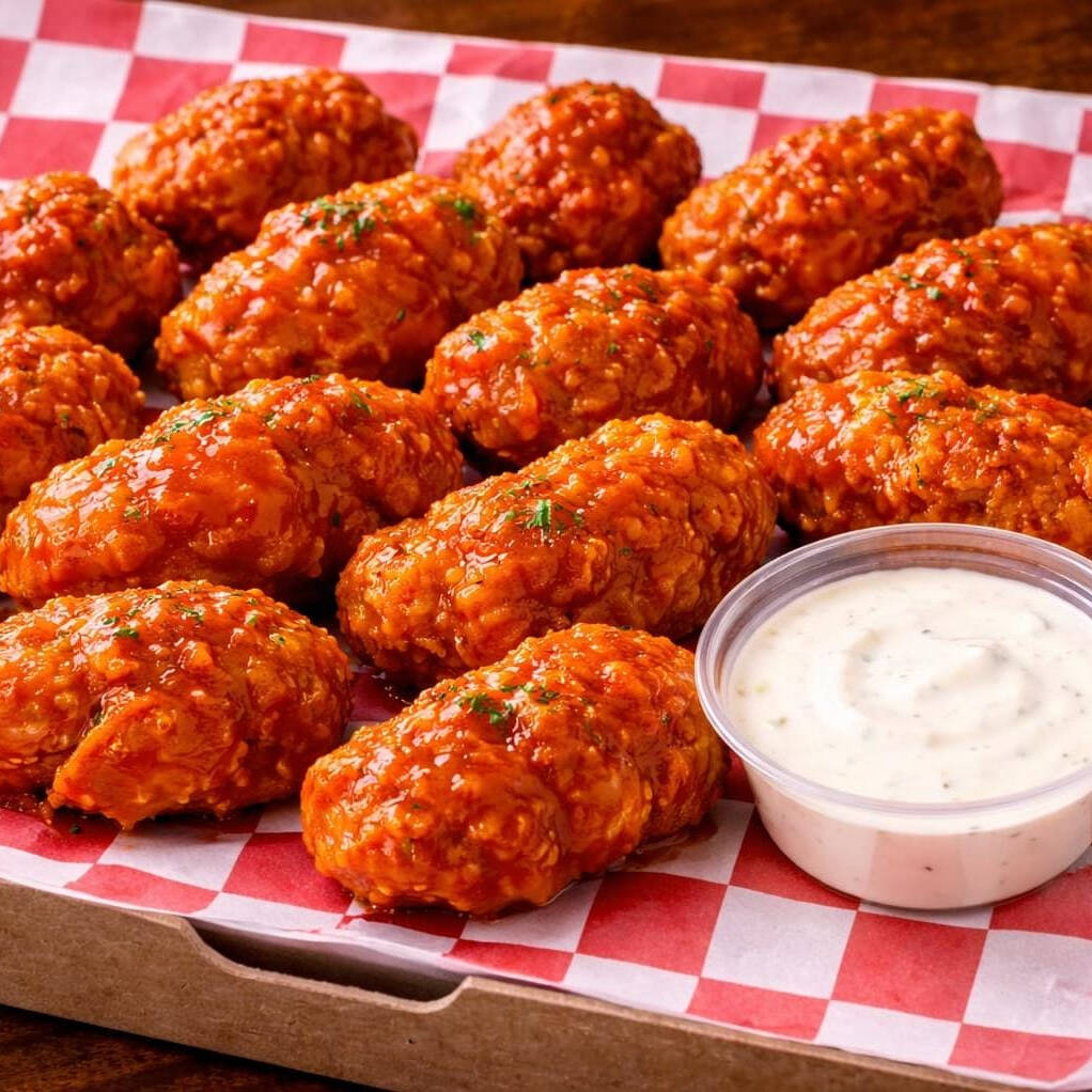 Exquisitos boneless de pollo empanizado bañados en salsa búfalo