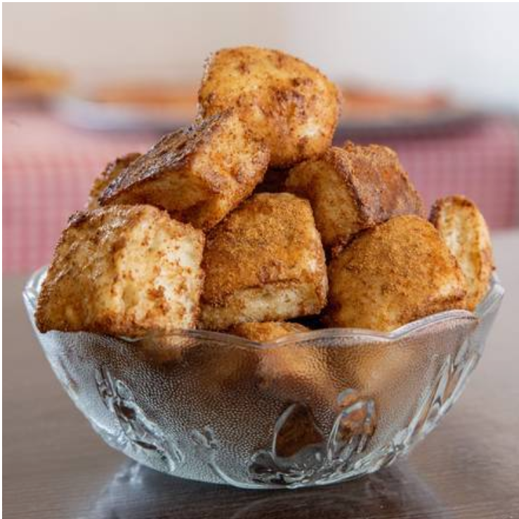 Pan horneado en mantequilla, bañado en leche condensada y canela.