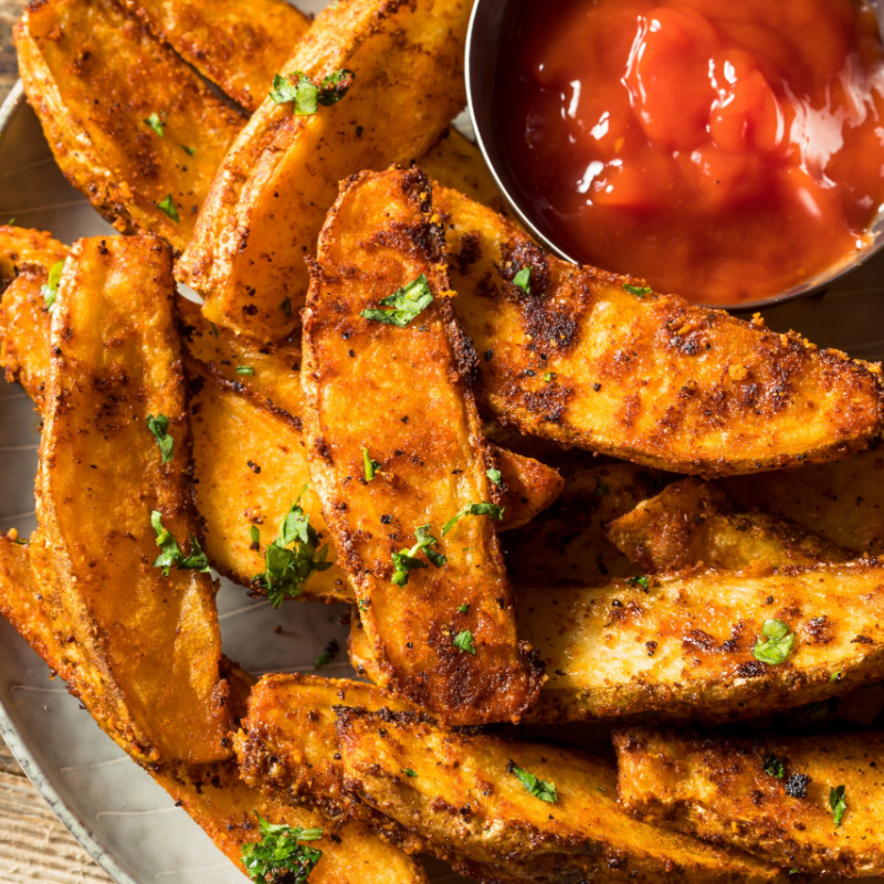 Papá cortada en gajos sazonada con especias de la casa y horneadas.