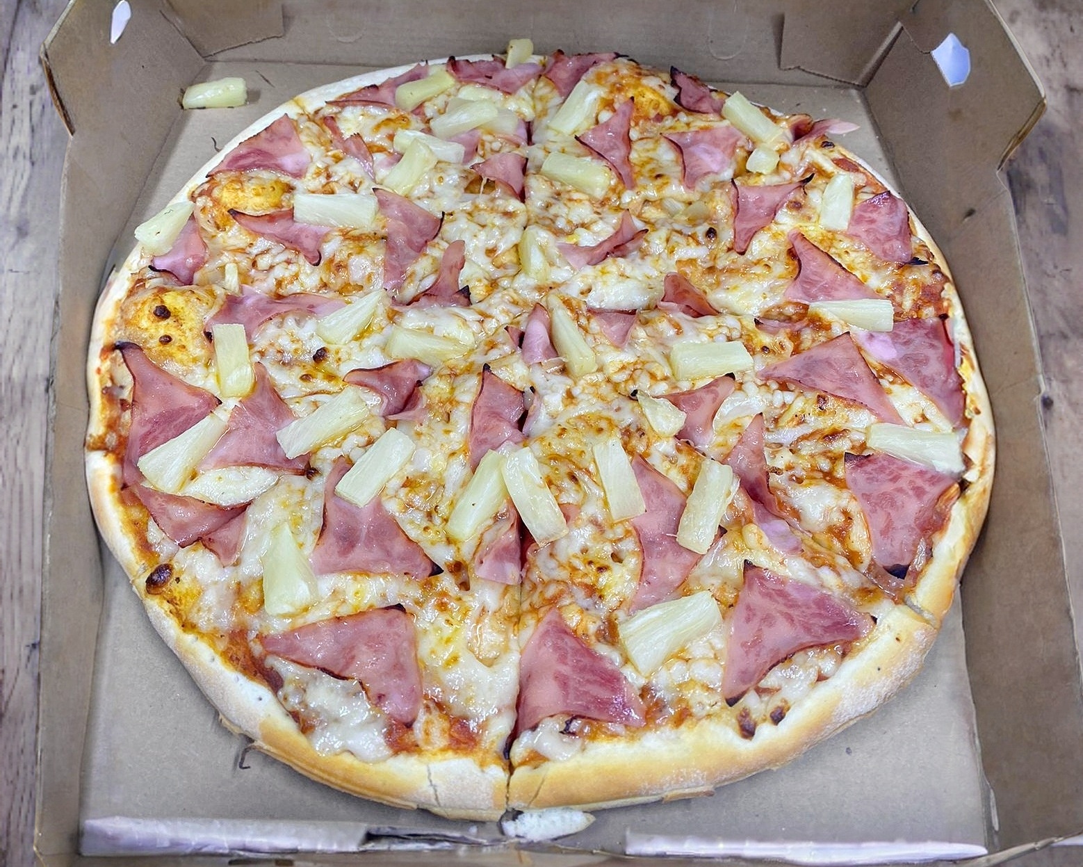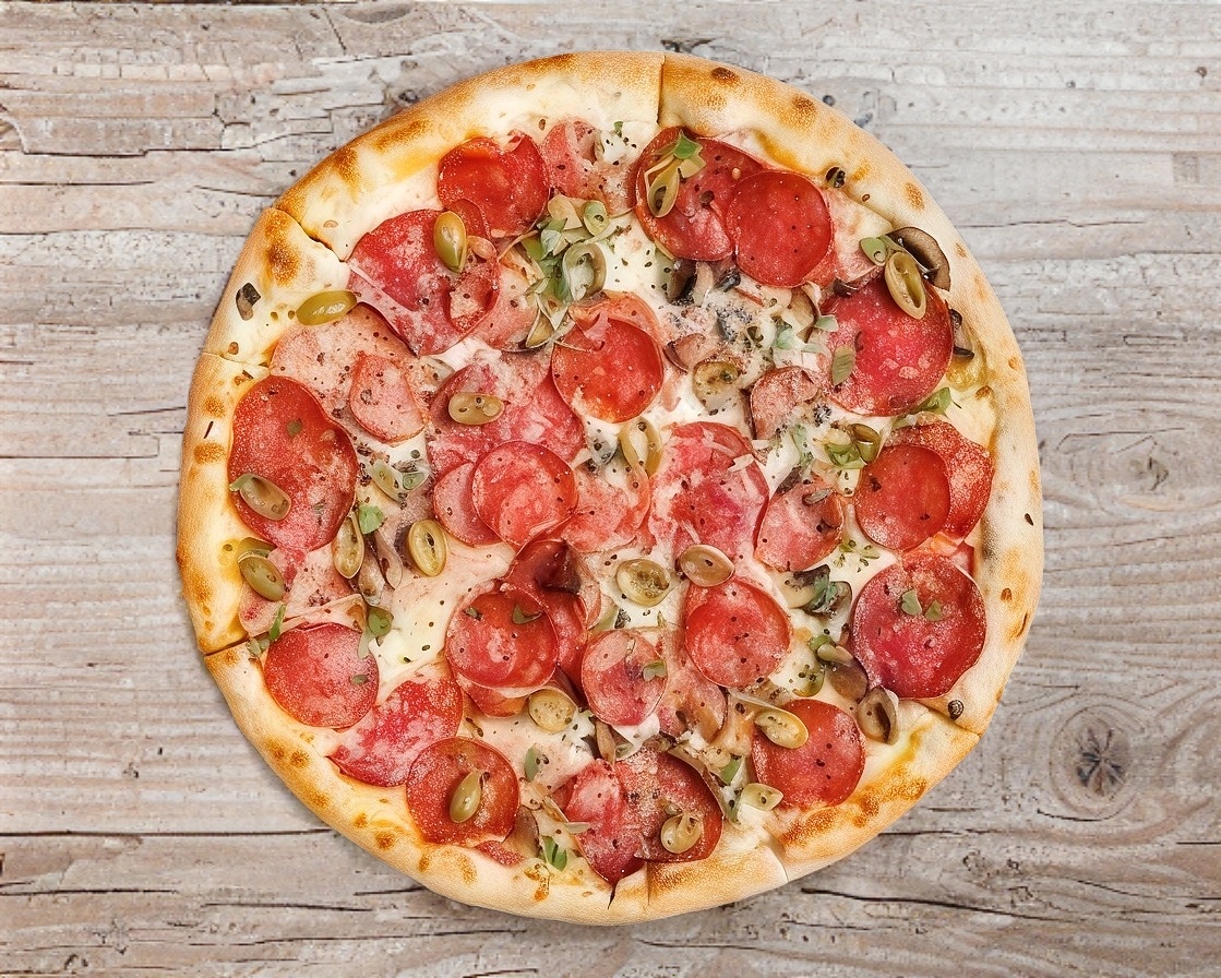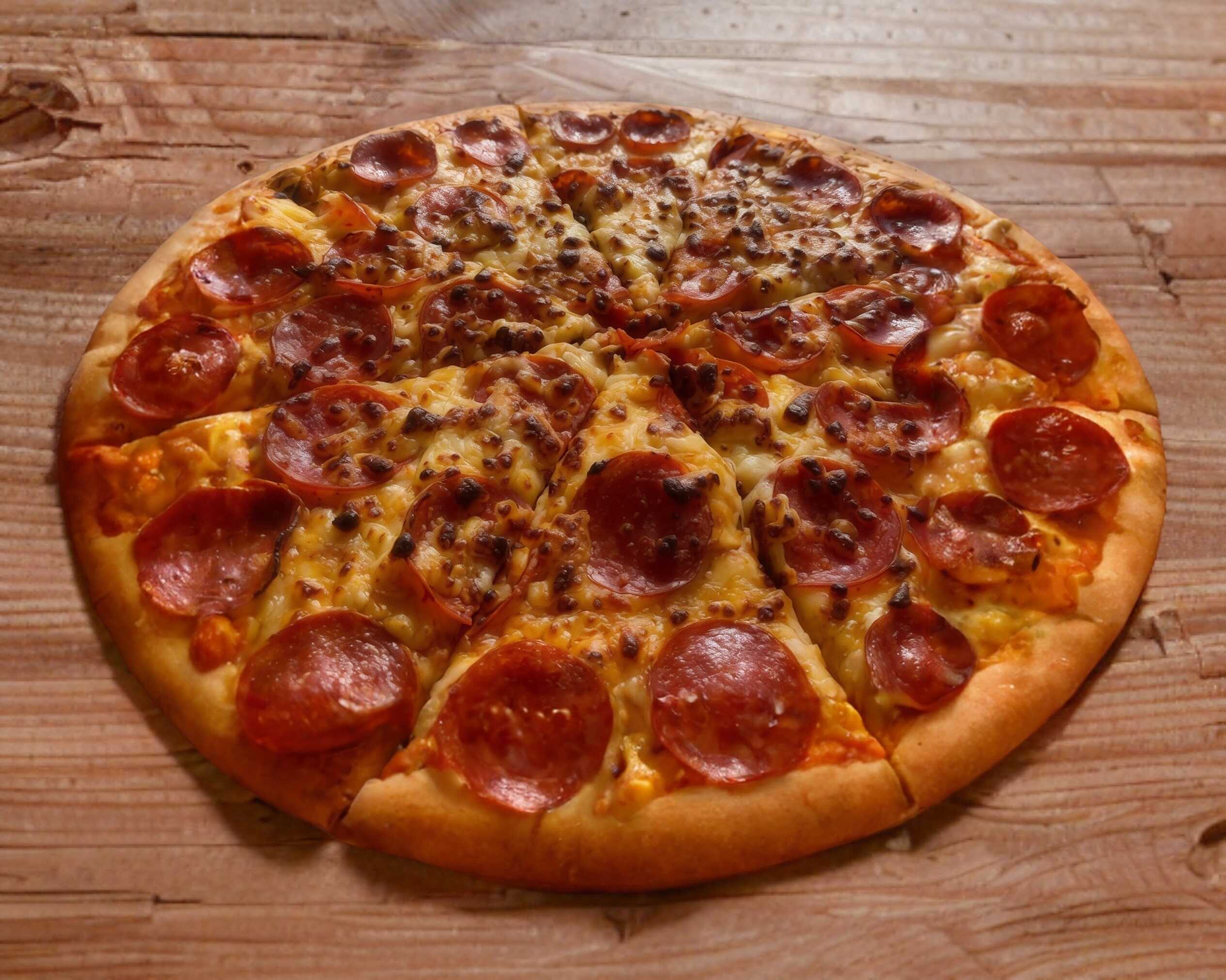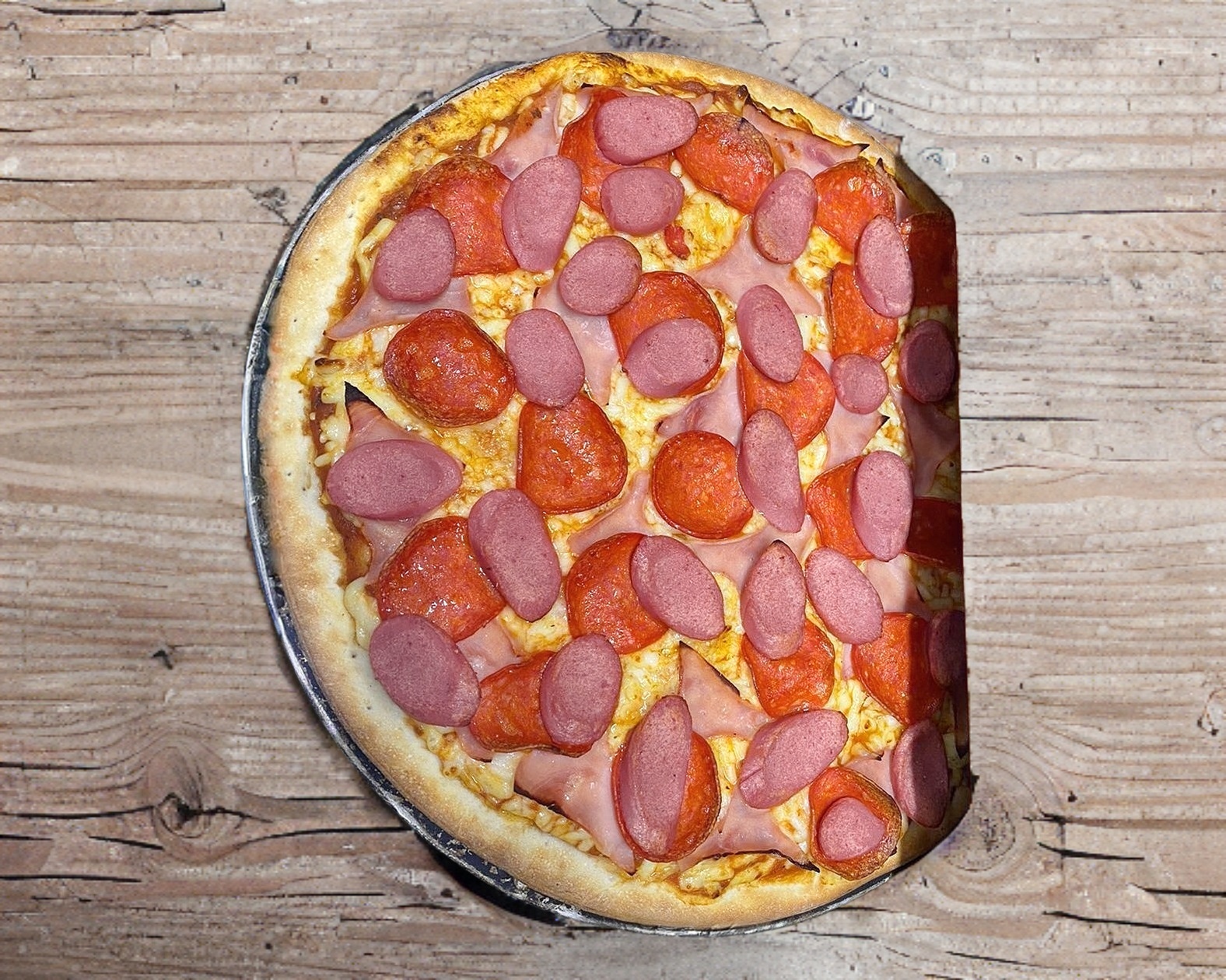 Pizza mediana con salsa y queso, de jamón, salchicha y peperoni.
