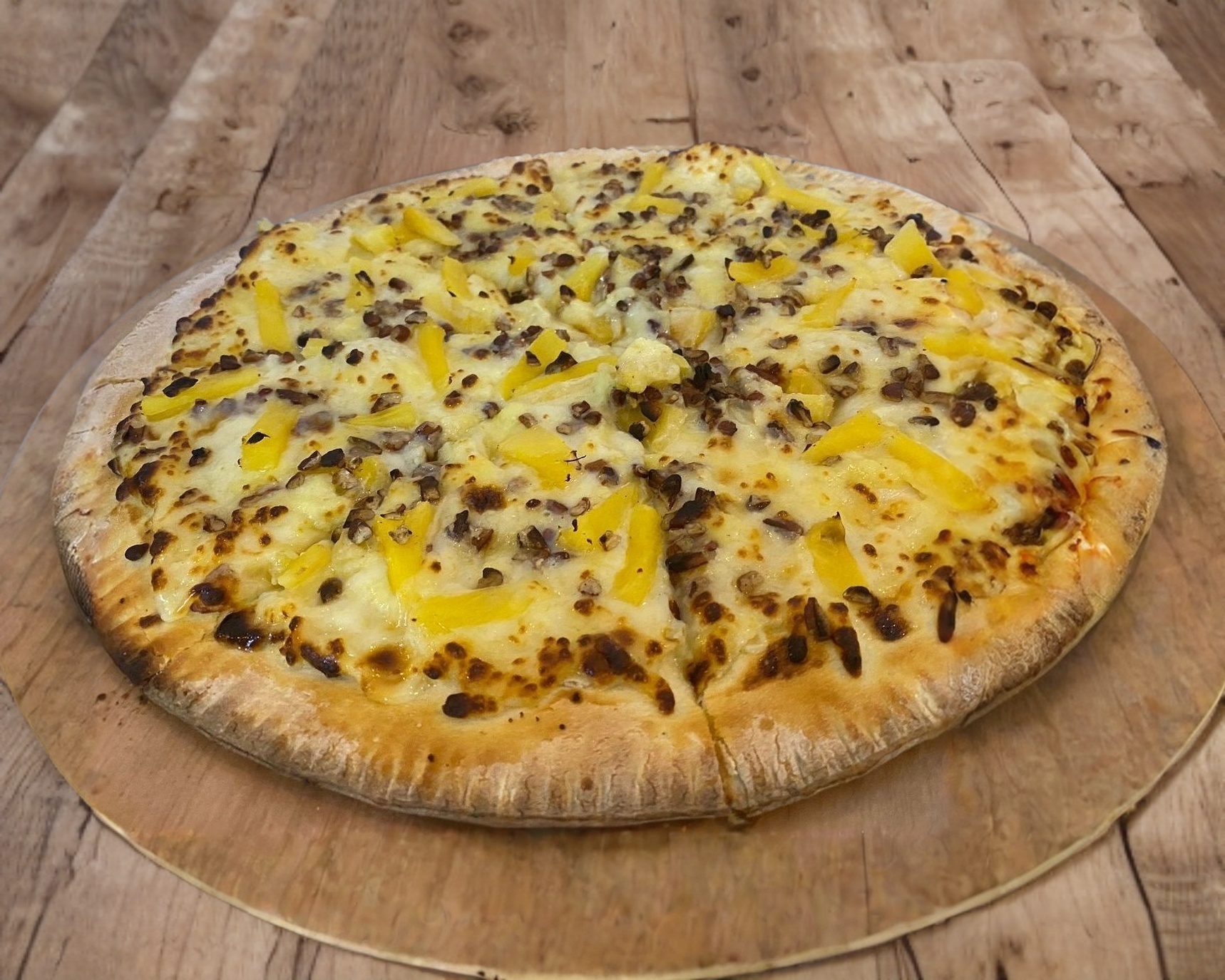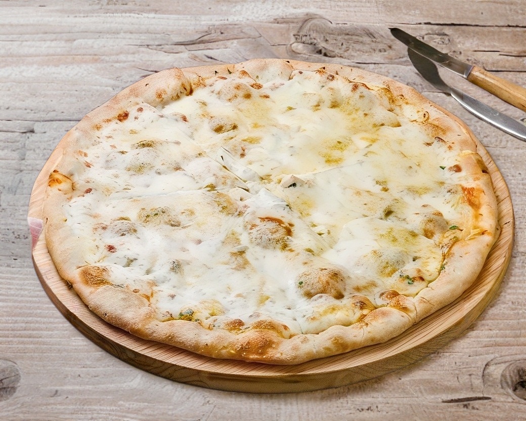 Pizza grande para máximo 4 personas de 35cm dividida en 8 rebanadas con salsa y queso. Un ingrediente a elegir.