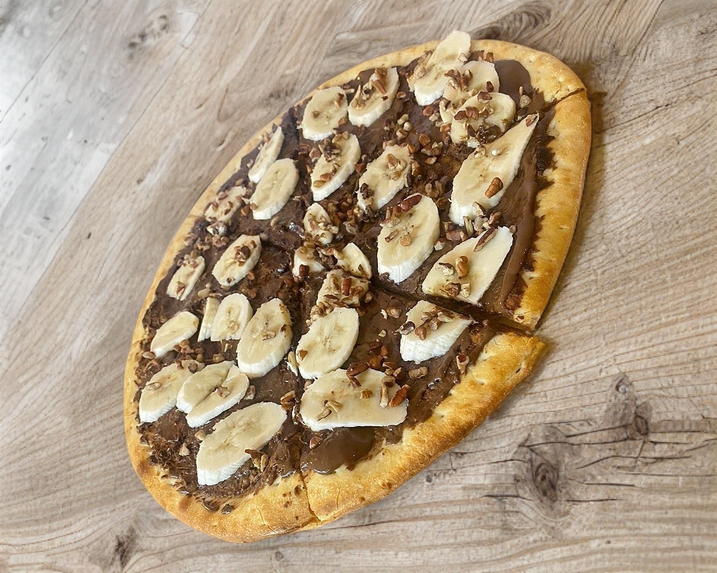 Pizza mediana de nutella con plátano nuez y un poco de lechera.