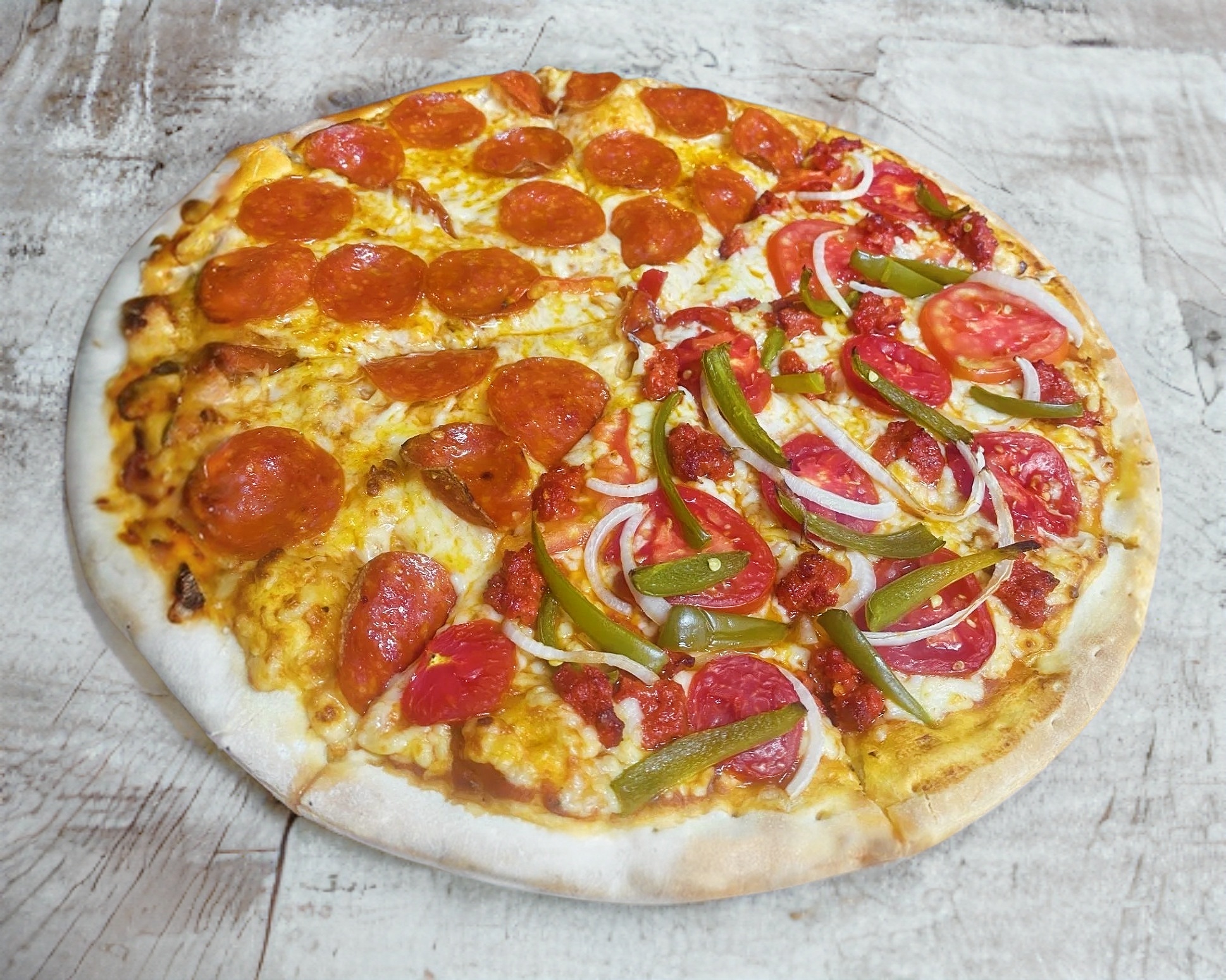 Pizza mediana con salsa, queso, chorizo, jitomate, cebolla y chile jalapeño.
