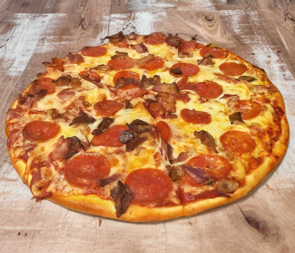 Jamon, peperoni, salami, queso gratinado y vegetales.