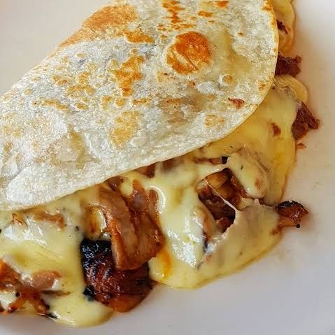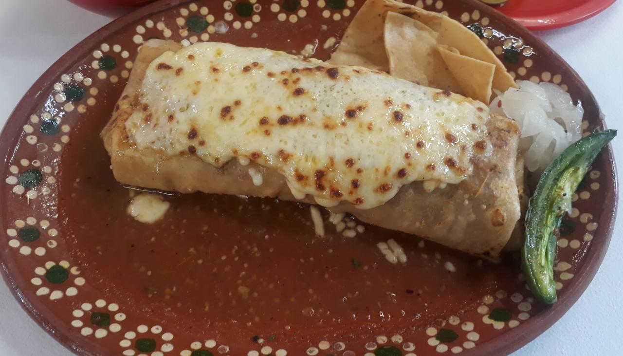 Relleno de bistec, carne al pastor y frijolitos, con queso gratindo acompañdo de salsa de tomate especial.