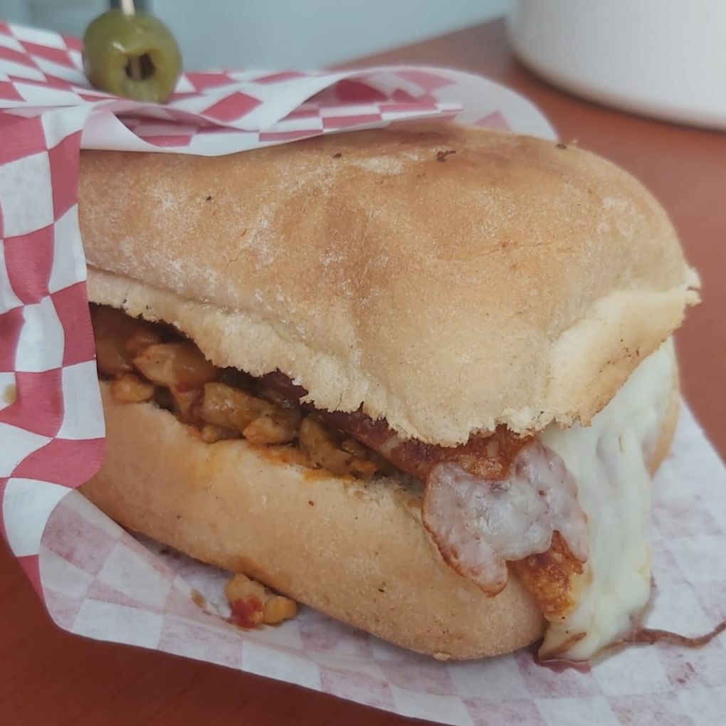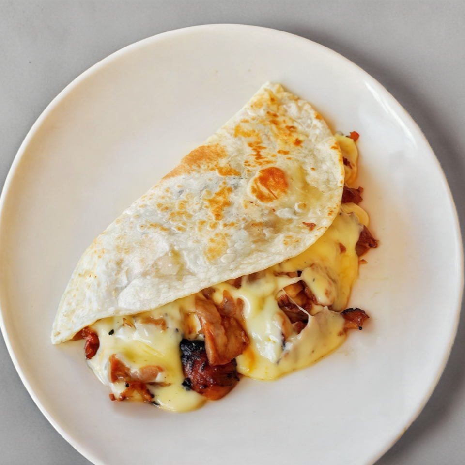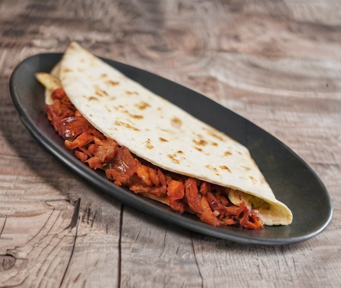 Relleno de carne al pastor y frijolitos, con queso gratindo acompañdo de salsa de tomate especial.