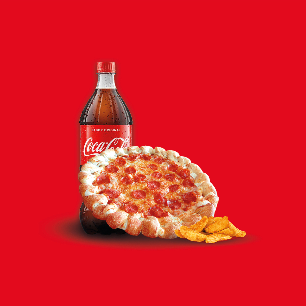 Deliciosa pizza Grande con Orilla de Bocaditos de 1 ingrediente acompañada de Papas Gajo y Refresco Familiar