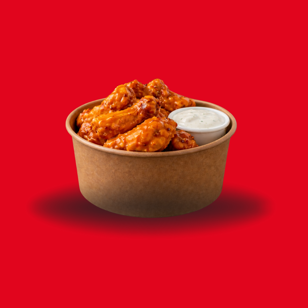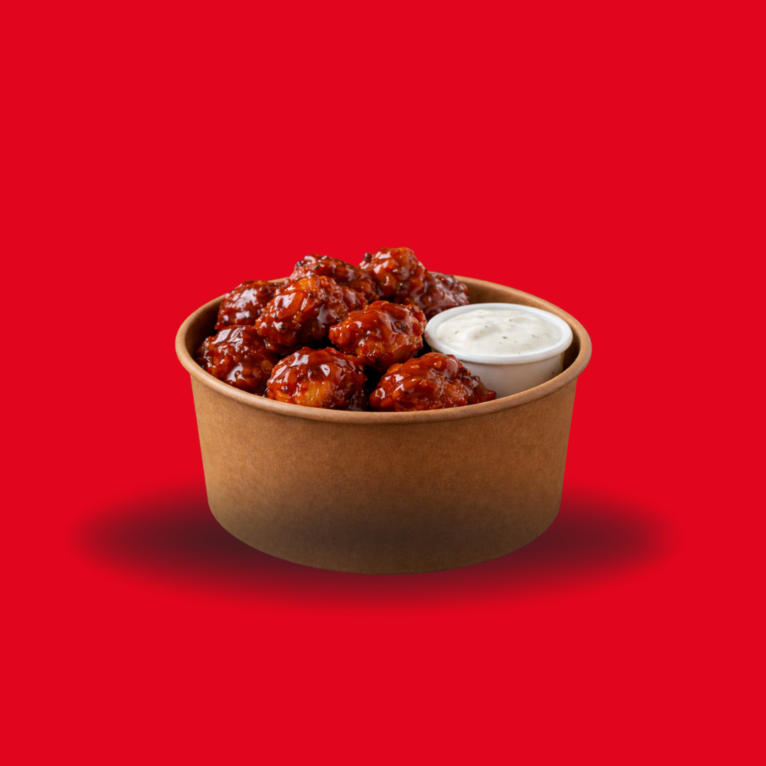 Deliciosos y crujientes 350gr de Boneless de pollo bañados en tu salsa favorita y acompañados de un dip