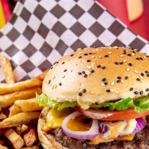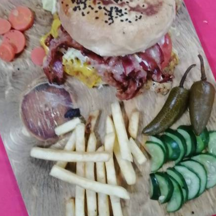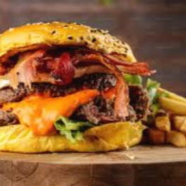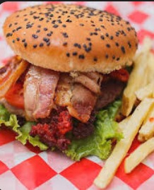 Carne de res, tocino, queso amarillo y vegetales.