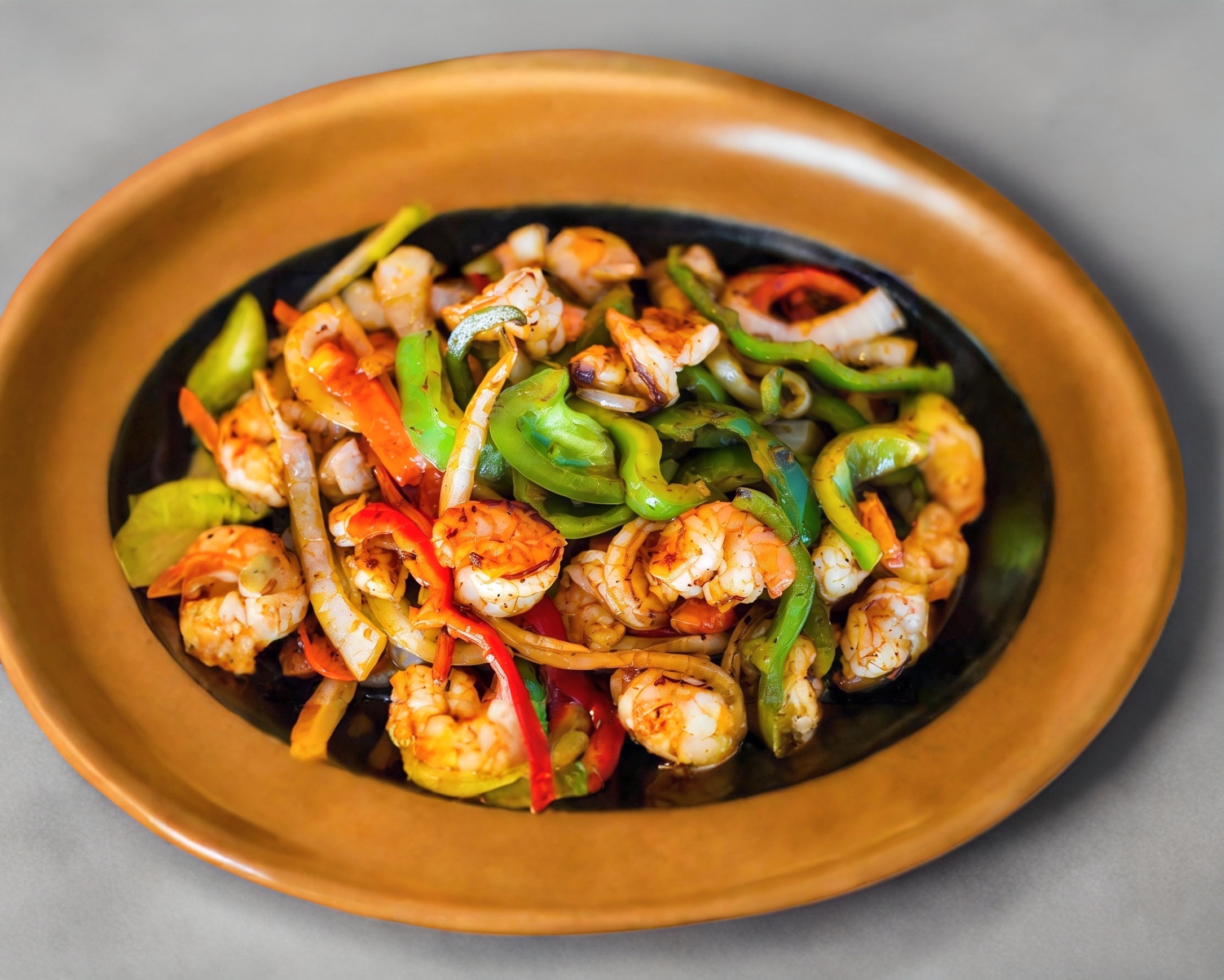 Guisado de cebolla, morrón, jitomate y camarones, acompañado de arroz, frijoles, guacamole, salsa de tomate y tortillas de maíz.