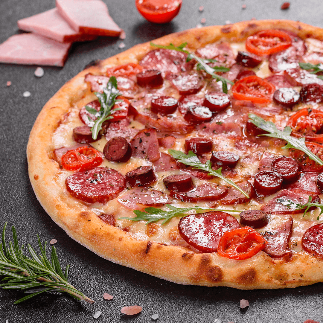 Peperoni, jamón, salchicha, chorizo, jitomate, cebolla morada, chile morrón, olivos negros y champiñón.