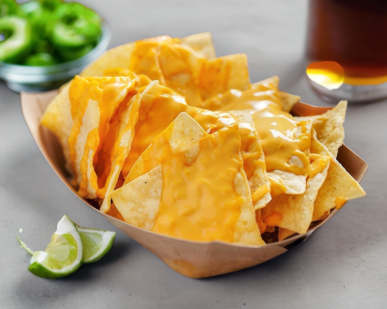 Totopos bañados con queso chedar y jalapeños.