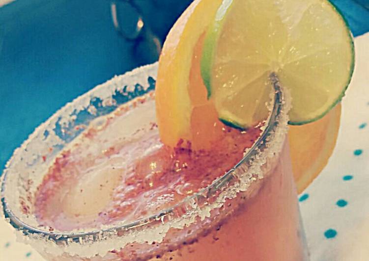 Bebida preparada con clamato, salsa Maggi, salsa Inglesa, salsa Valentina, sal y limón con hielos.