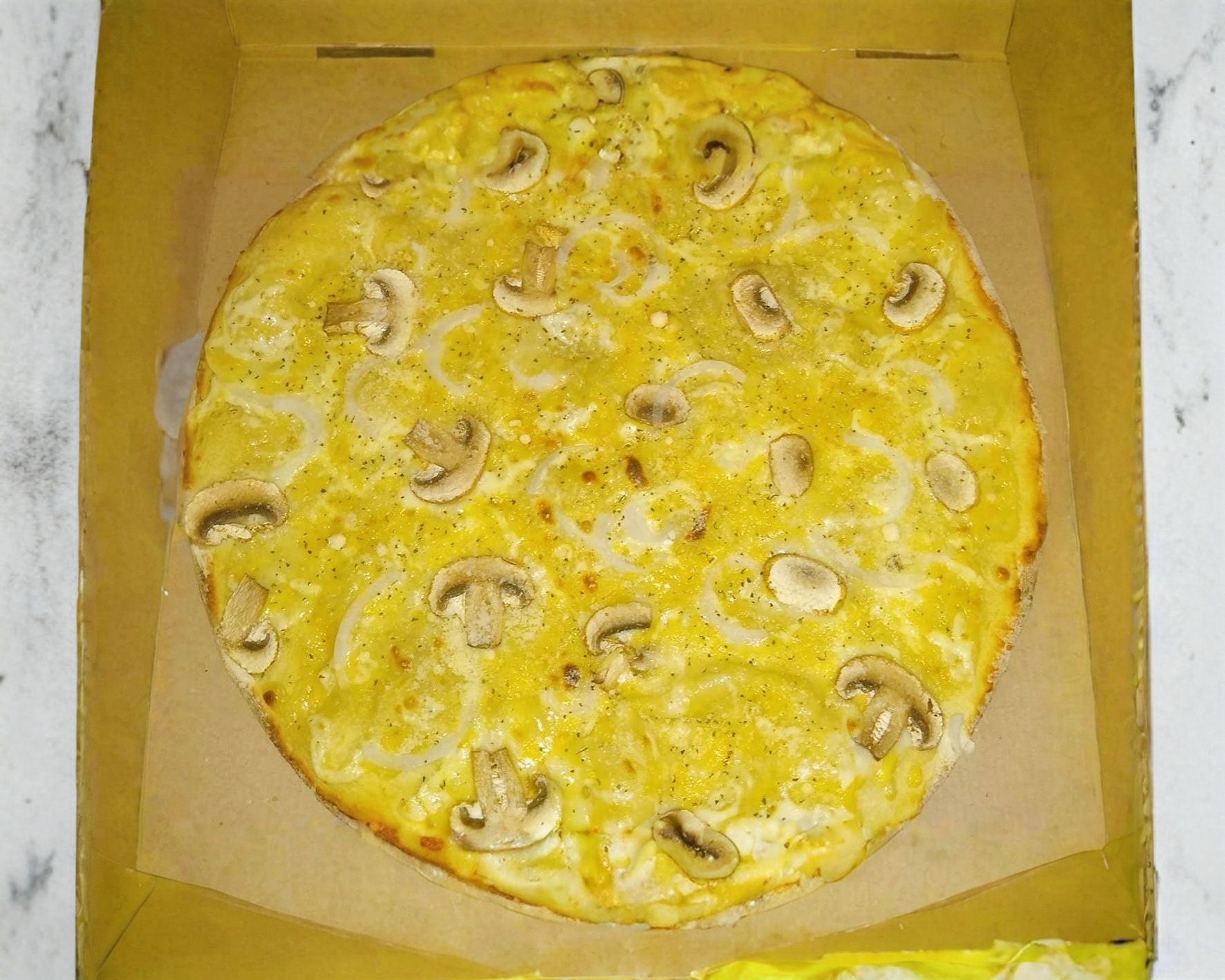 Salsa Blanca Alfredo, Queso, Champiñón, Cebolla, Orégano y Parmesano. SOLO TRAE chile quebrado 2 sobres y 3 sobres de catsup.