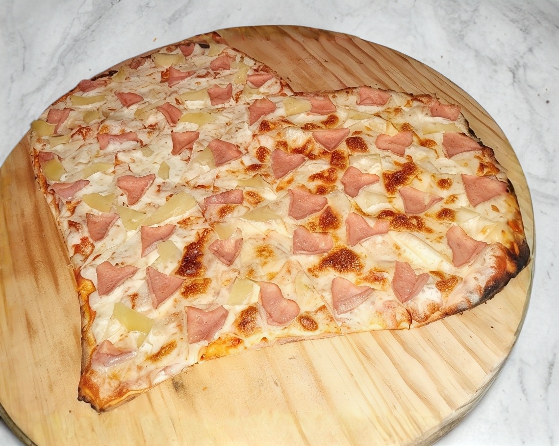 Salsa Roja, Queso, 1/2 Jamon Piña y 1/2 Pepperoni. SOLO TRAE chile quebrado 1oz o 2 sobres y 3 sobres de catsup o 2oz.