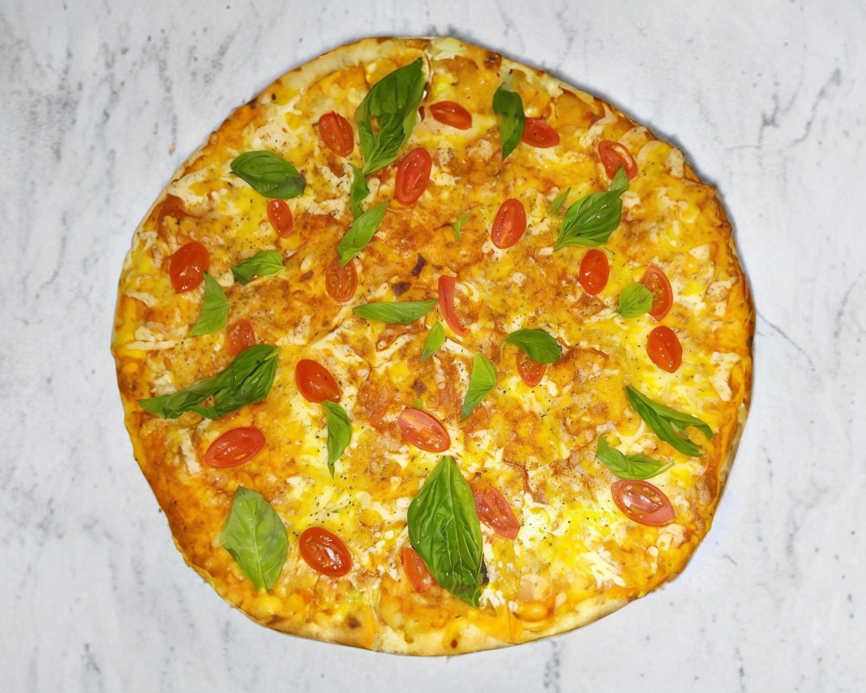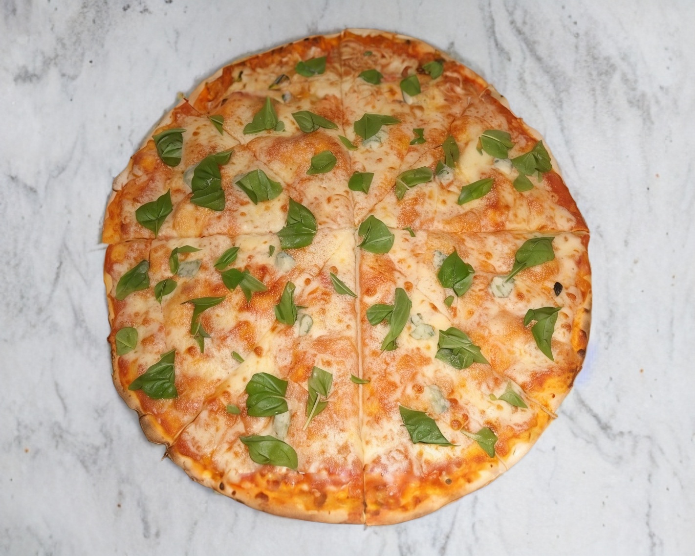 35cm, con Queso Gruyere, Queso Provolone, Queso Azul, Albahaca, Salsa Roja y Queso Mozzarella, Incluye 1 Chile en Aceite.