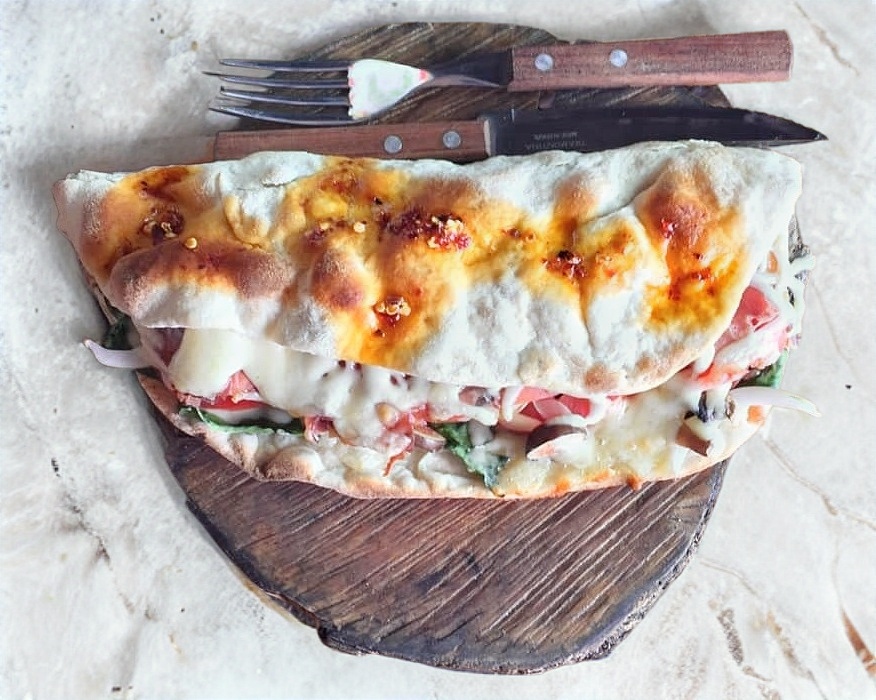 Panini hecho con base de pizza de 25cm, Aderezo Ranch, Lechuga, Jitomate, Espinaca, Aceite de Olivo, Champiñón y Cebolla, Ármalo con 1 Ingrediente. SOLO TRAE chile quebrado 1 sobre y 2 sobres de catsup.