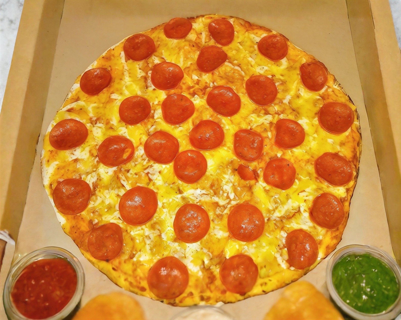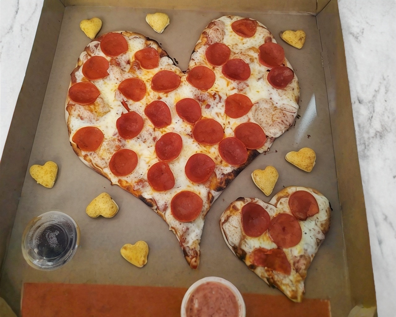 Salsa, Queso y Pepperoni en forma de corazon. SOLO TRAE chile quebrado 2 sobres y 3 sobres de catsup
