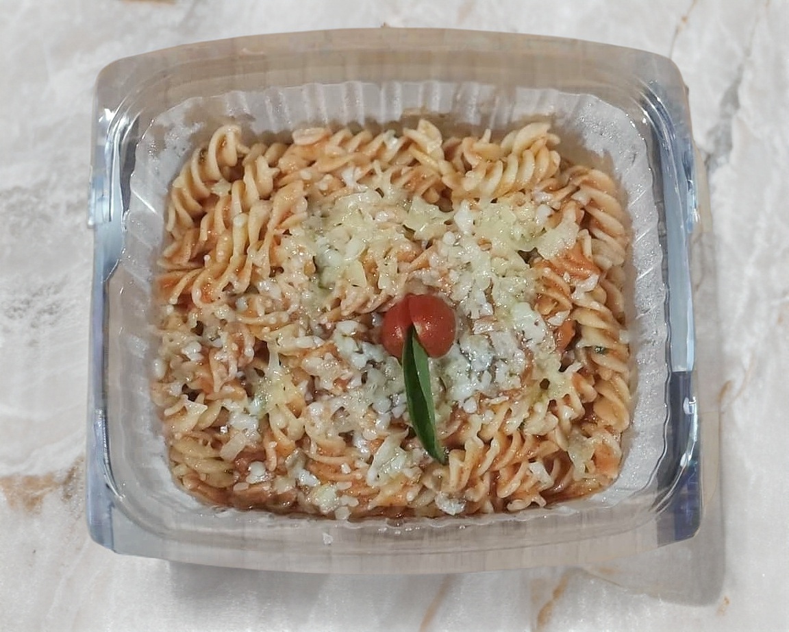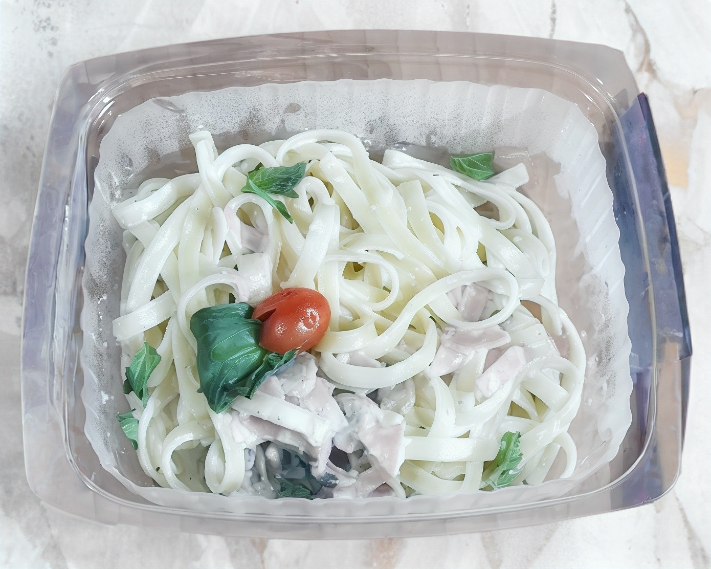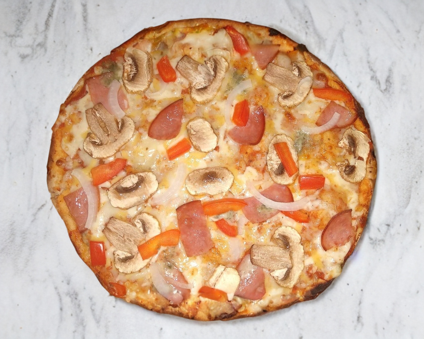 Salsa alfredo, Jamon, Champiñon, Decorado con Cherry y Albahaca, Incluye 1 Chile en Aceite.