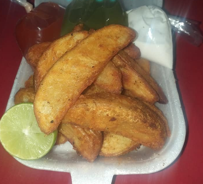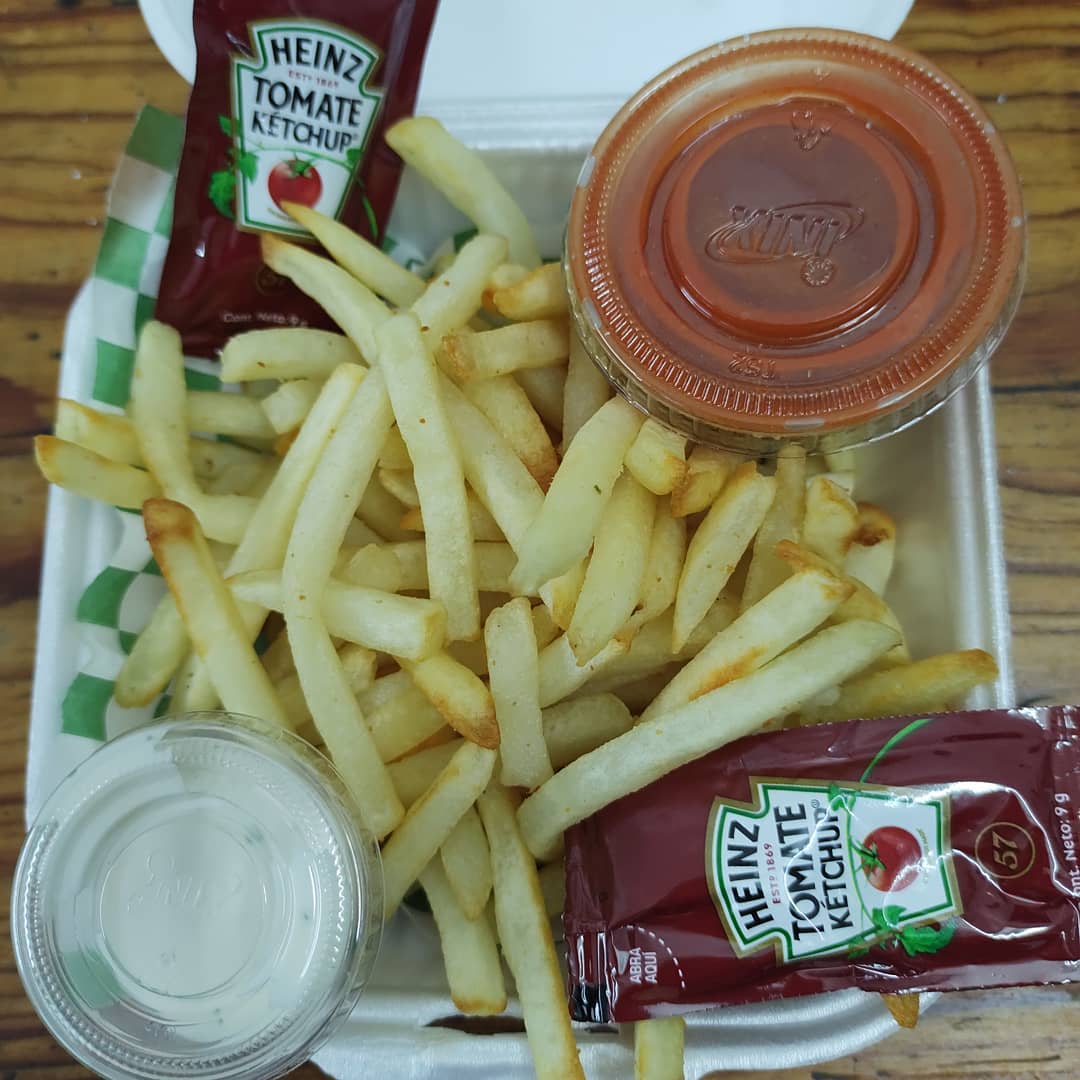 220g papas a la francesa sin grasa, incluye lemon peppers, ranch, salsa picante RedHot y catsup.