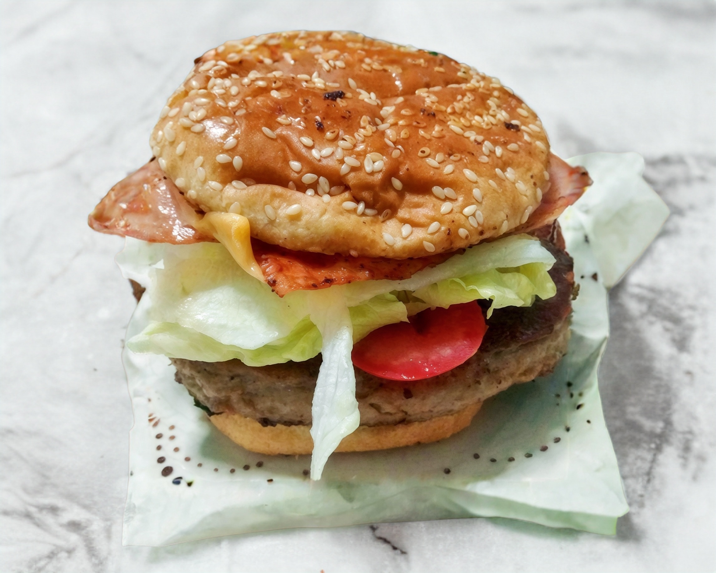 Pan con ajonjoli, 150g carne, crema, queso amarillo, lechuga, jitomate, cebolla y aderezos. hasta 2 ingredientes extras a seleccionar NO INCLUYE PAPAS.