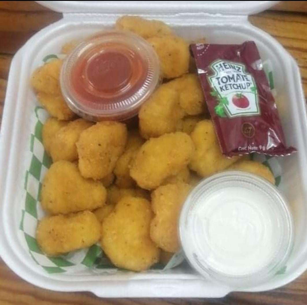 220g Palomitas de pollo sin grasa, Incluye Ranch, salsa picante RedHot, y Catsup.